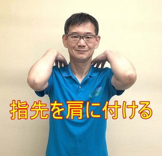 ・鼻で息を吸いながら肘を肩より上に上げて背骨(腰・背中・お腹の筋肉)が伸びていることを感じる