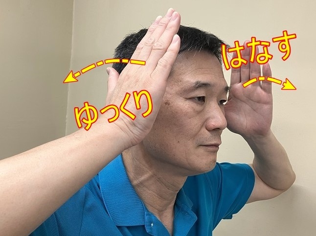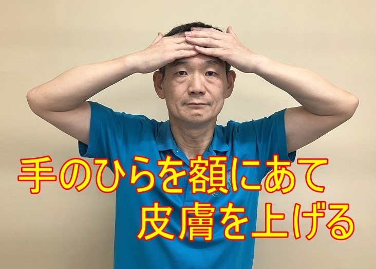 ・額に手のひらを当てて、前頭部の皮膚を上げます