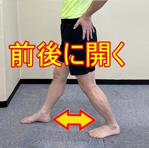 ・脚を前後に開く(つま先の向きはなるべく真っすぐ)