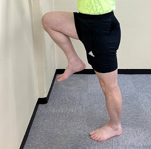 ・膝が高く上がるように交互に脚上げを行う。(目安:5~10回ずつ)