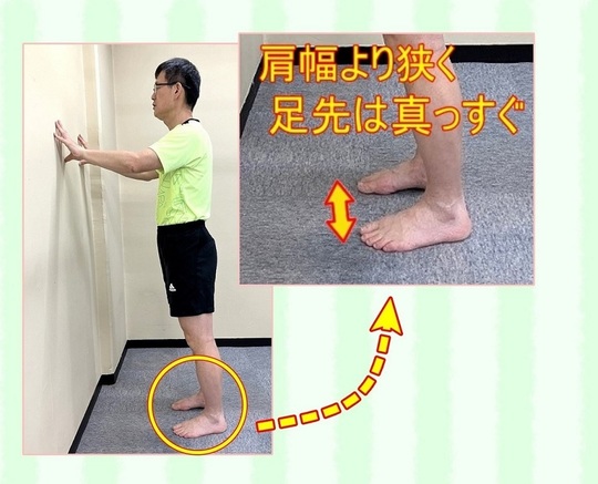 ・壁に手をついて立つ(両足の幅は肩幅より少し狭く、足先は真っすぐ)