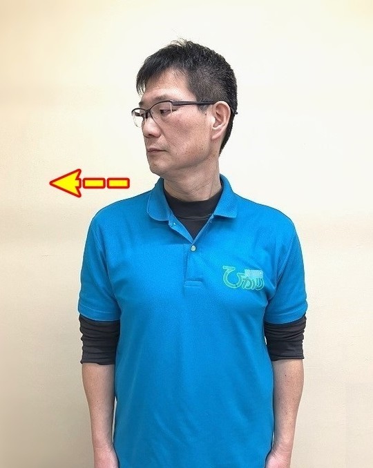 今回は、首の横向き動作が辛い時には肩を近づける事で楽に横を向く事が出来る