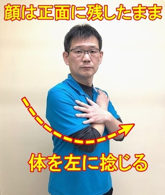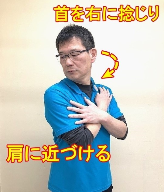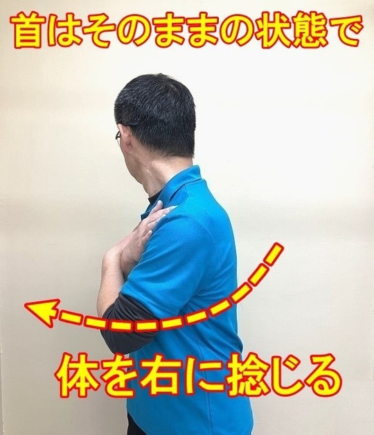 首の筋肉・関節を単独で動かす時に痛いのですから、痛くない肩を捻じる動作を利用します。