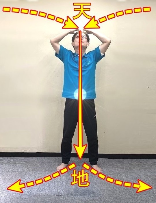 東洋医学や気功などの「天・人・地(てん・じん・ち)」の概念は、自然と人間の調和を表すとても大切な考え方です。私達は天の恵みを地に受けて育ったものを栄養として生きる力(エネルギー)をいただいています。地に足を着け、太陽の光を浴びて元気な体で過ごす!生きるために一番、大切ななことではないでしょうか?今回のやり方は「天」は太陽の光、「地」は地熱のパワーをイメージしたワークです。